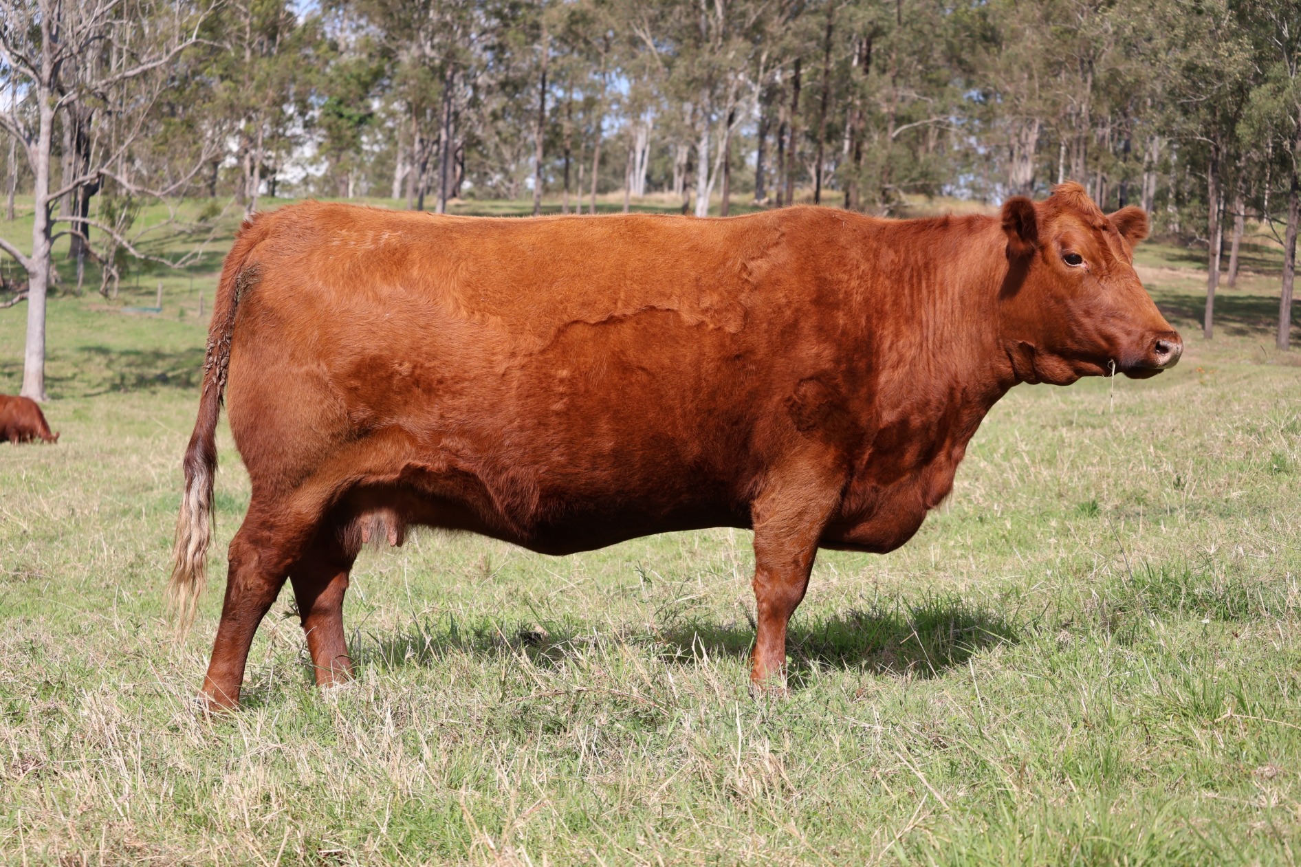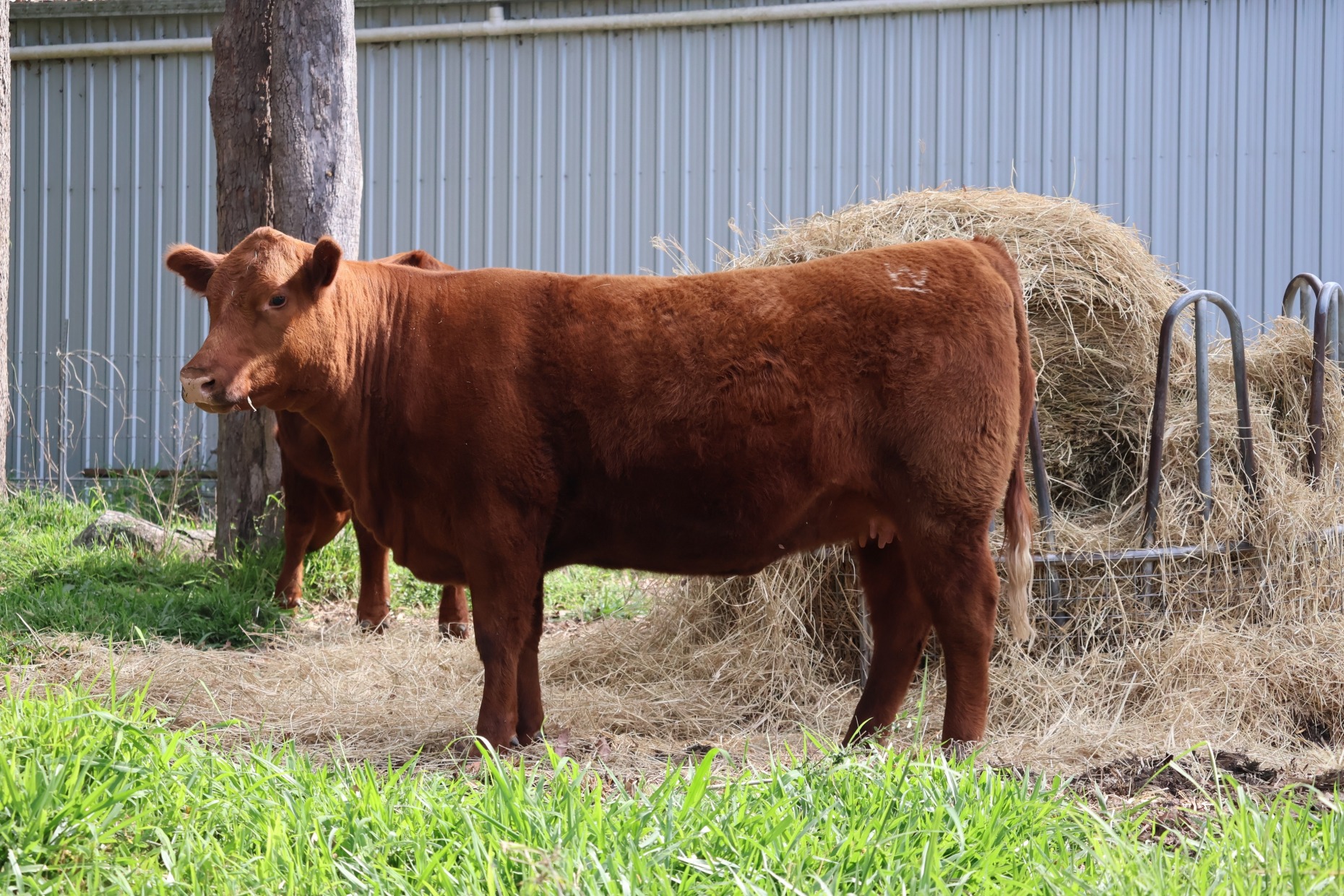 We had the good fortune to see Penny at the Brisbane EKKA in 2019. Great structurally and a beautiful temperament. We were pretty keen to get her into our program, but didn't give ourselves much hope. To our surprise, Heather said yes to our request - thankyou Heather, we are indebted to you for entrusting us with her. Sired by the tremendous AI bull in OLC CHATEAU K465, and out of the RED NORTHLINE FAT TONY 605U cow in ROSEMULLION RED HELEN H2, Penny has been a great addition to our herd and will be here for many years to come.